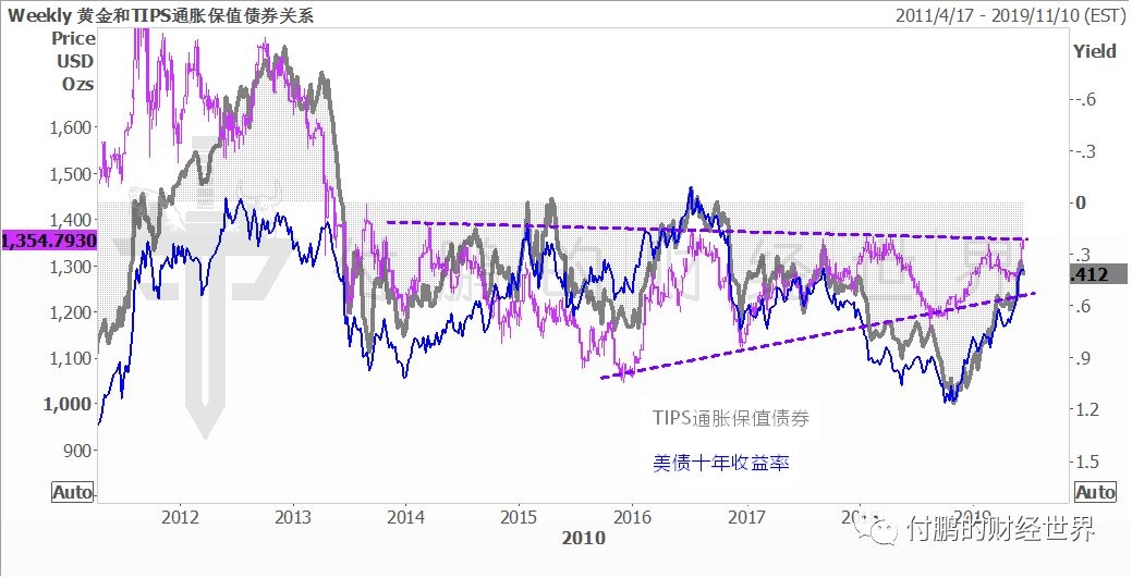 5月份的两份付鹏说里面已经详细的解释了黄金当前面临的情况,总结一下就是老生常谈:黄金的逻辑就是TIPS看的就是通胀预期和债券为主导的利率预期之间的变动差,这部分逻辑的内容已经在无数以前的关于黄金的内容中和大家分享过了,基本框架,美国加息也好,降息也好,缩表也罢不缩也罢,地缘政治,风险偏好等等这些新闻通稿式的解释都不能中观和微观的解释黄金的变动逻辑,所以就记住一点就好黄金就是“TIPS通胀保值债券”的对标物,关于每次过去的组合变动的分解动作我也很详细的在5.27的《详解过去十年的波动-通胀和利率之间的速度差组合》中和大家详细的分解过,记住一副逻辑图想清楚就好了: