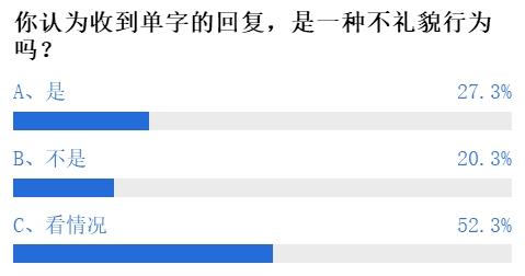 对于单字的回复是否不礼貌,超过一半的网友认为要视情况而定,同时也有27.3%的网友认为使用单字回复就是不礼貌,仅有20.3%的网友认为回复单字并非不礼貌的行为。