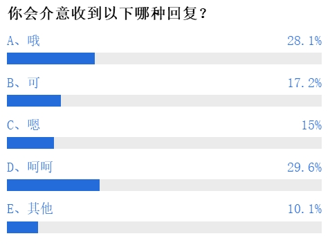 在“你会介意收到以下哪种回复?”这项投票中,最多人选择的是“呵呵”,接近30%,其次是“哦”,占28.1%,选择“可”“嗯”的分别占17.2%和15%。