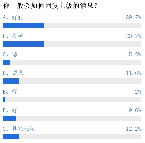 而对于回复上级消息的用语,选择使用“好的”和“收到”的网友各占近30%,还有少数网友选择使用“嗯嗯”或者是其他长句,选择使用“好”“行”“嗯”的网友则更少,总占比不到20%。