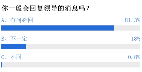 调查数据显示,超过8成的网友表示对领导的消息向来是有问必回,只有不到20%的网友表示不一定会回复领导的消息,0.8%的人选择不回复领导。