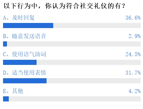 认为及时回复、使用语气助词和适当使用表情包是符合社交礼仪的行为的网友人数差不多,各占30%左右,仅有不到3%的网友认为随意发送语言也是符合社交礼仪的行为。