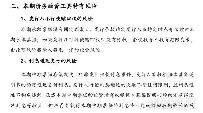 根据上述发行说明书,该债券为永续票据,没有固定到期日,发行条款约定发行人在特定时点有权赎回本期永续票据,如果发行在可行使赎回权时没有行权,会使投资人投资期限变长。永续票据发行后计入所有者权益,可以有效降低发行人资产负债率,对财务报表具有一定的调整功能。