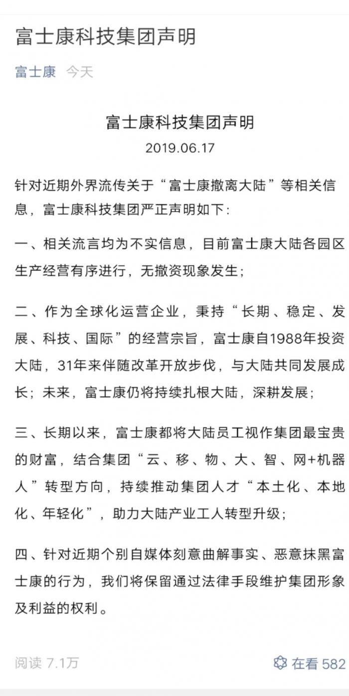 6月17日,富士康科技集团发布声明,辟谣近日“富士康撤离大陆”的消息。