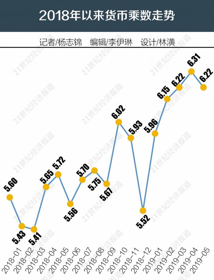 根据央行最新公布的数据计算,5月末货币乘数为6.22,相比四月的历史峰值(6.31)有所回落。此前货币乘数不断攀升,由2018年12月的5.52上升至2019年4月的6.31。