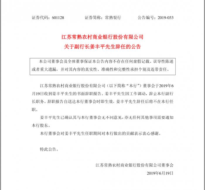 常熟农商行副行长姜丰平辞职。