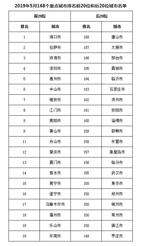 而从2019年1-5月看,168个重点城市中临汾、石家庄、邢台市等21个城市空气质量相对较差;海口、拉萨、深圳市等21个城市空气质量相对较好。