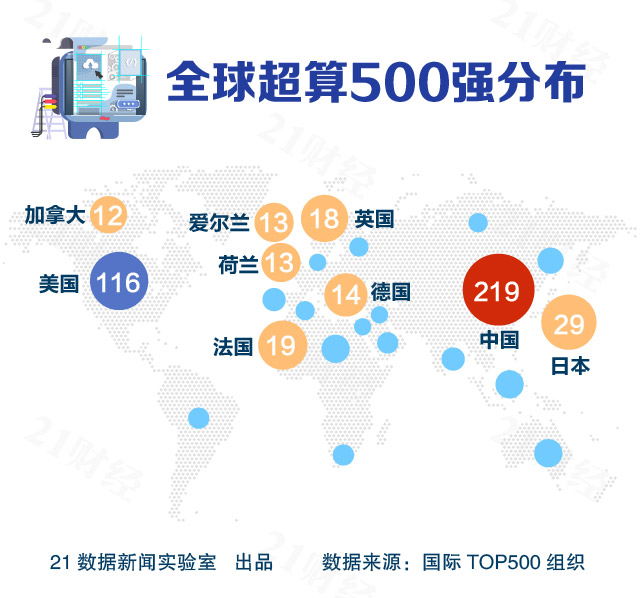 据21数据新闻实验室统计,全球超级计算机500强一共分布在24个国家或地区,其中,亚洲国家或地区几乎占据了一半。