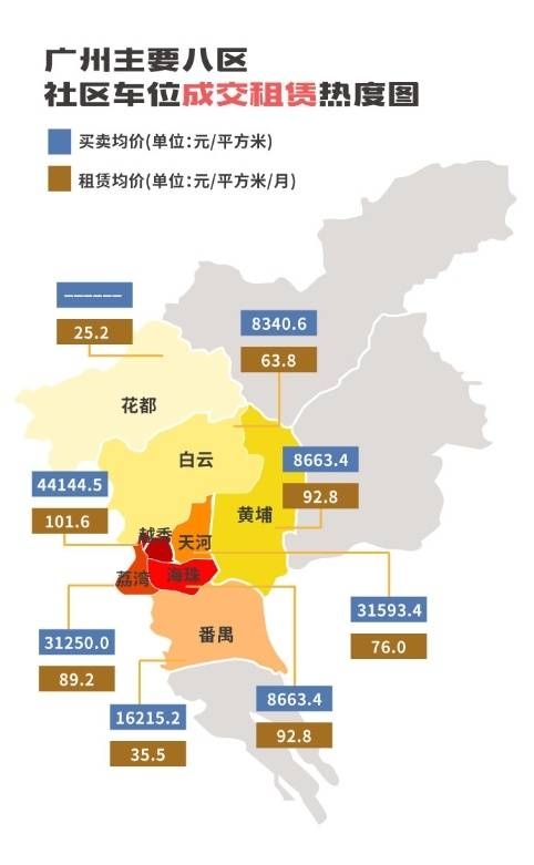 值得注意的是,黄埔区的车位,买卖均价并不突出,仅为8663.4元/平方米,但车位租赁价格超过荔湾和天河的整体均价,达到92.8元/平方米/月,排名全市第三(前两位为越秀和海珠)。