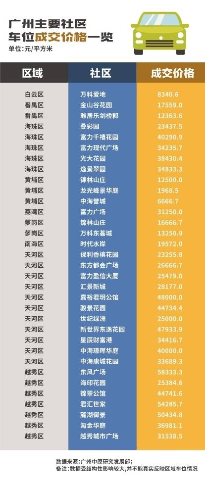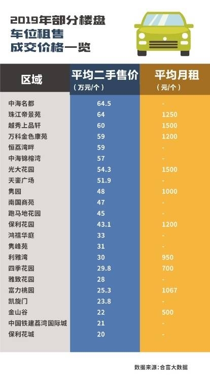 从单个楼盘来看,单个车位在60万元左右的楼盘不少,合富大数据显示,中海名都、珠江帝景苑、越秀上品轩、万科金色康苑、恒荔湾畔等都在这个量级,当然,这只是近期成交数据的不完全统计。
