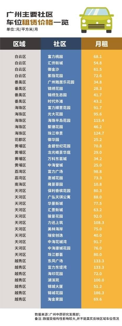 租赁均价最高的也是越秀,超过101元/平方米/月。以单个车位面积12-14平方米来计算,在越秀区,买一个车位均价在53-62万元左右,车位月租为1200-1400元。除此之外,海珠车位月租也过千元。至于天河,在商务区内,以珠江新城为代表,车位月租价格也过千元,不过,因为天河东部区域车位月租相对便宜,总体月租均价被“拉平”。