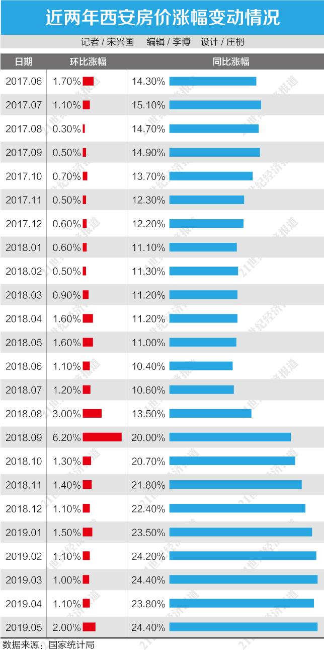根据国家统计局发布的70个大中城市房价数据,2019年以来,西安的新建商品住宅价格同比涨幅持续领跑全国。5月,西安新房价格涨幅同比上涨24.4%,环比上涨2.0%,两类涨幅均在70城居首。