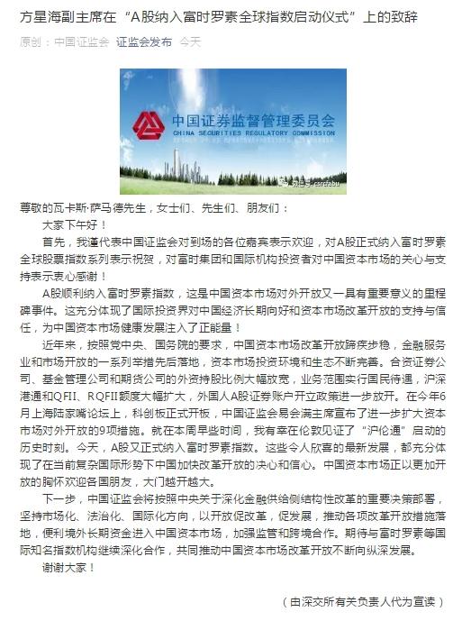 方星海表示,就在本周早些时间,我有幸在伦敦见证了“沪伦通”启动的历史时刻。今天,A股又正式纳入富时罗素指数。这些令人欣喜的最新发展,都充分体现了在当前复杂国际形势下中国加快改革开放的决心和信心。中国资本市场正以更加开放的胸怀欢迎各国朋友,大门越开越大。