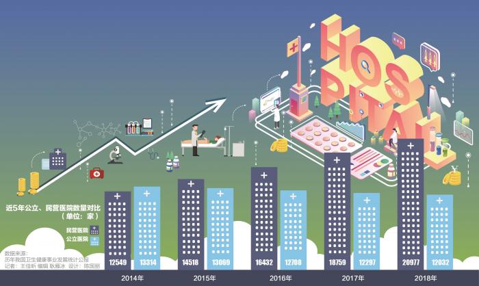 目前,社会办医已取得巨大进步。据国家卫健委公布的数据,2014-2018年,民营医院数量以每年超过10%的速度增长,目前已有2万多家,床位数翻了一番多。2015年,民营医院数量首次超越公立医院,同时公立医院数量连续5年下降。