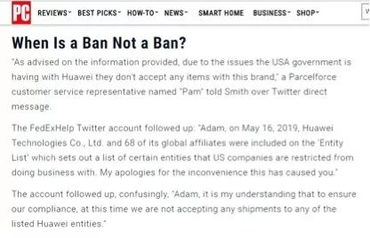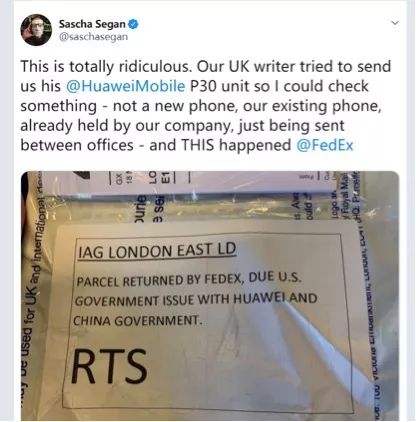 事情的起因,是美国《个人电脑》杂志的编辑们昨天震惊地发现他们的英国编辑部寄给美国编辑部用来进行评测的一部华为P30的手机,居然被美国联邦快递以违反美国政府对华为的禁令为由而退回了。