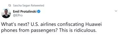 此事还很快也引起了其他美国科技媒体和网站的围观。有美国媒体人就吐槽说:这是不是意味着以后美国的航空公司也要没收乘客的华为手机了?