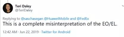 而下图中华为公司的这位发言人也表示联邦快递“完全误读”了美国政府的禁令。