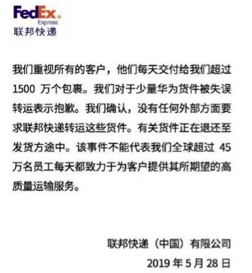 可联邦快递在最初面对质疑时却并没有意识到自己的错误,反而还“理直气壮”地通过客服对美国《个人电脑》杂志表示说美国政府的禁令就是要求美国公司不得和华为有业务往来的,所以公司必须服从。