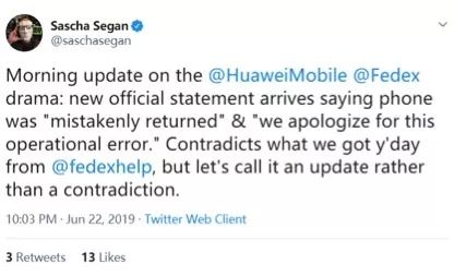 讽刺的是,在这件异常荒唐的事情被《个人电脑》杂志曝光后,昨天深夜联邦快递又给出了一个与之前的回复完全“矛盾”的新回复,称这事是联邦快递“搞错了”,《个人电脑》杂志社的编辑从英国编辑部寄到美国编辑部的华为的手机是被“错误退回的”,并向这家杂志社进行了道歉。