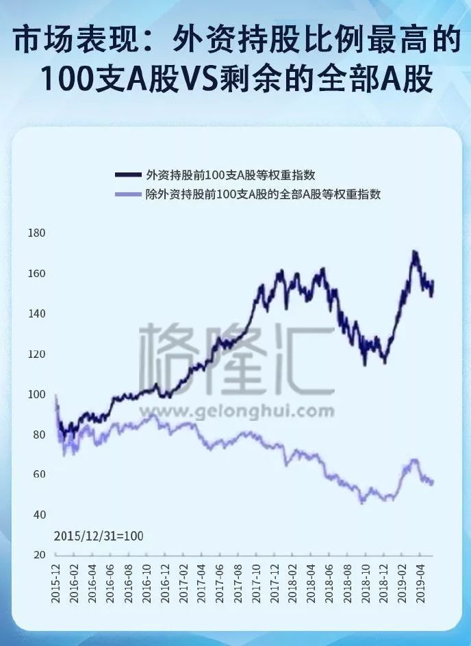 值得注意的是,超越5178点高位的193只个股,市值中位数为258亿元,不足50亿元市值的个股只有7只。其中陆股通买入标的达到了169只,占比达87.56%。 近日,有媒体根据外资持股比例最高的100只A股和剩余的全部A股,分别编制了等权重指数,结果显示两个指数自2016年至今的市场表现大相径庭。