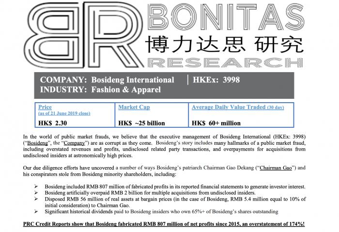 此番大跌被认为是沽空机构Bonitas Research当日发布的针对波司登的报告,称其“执行管理层一如既往地腐败。”包括许多公开市场欺诈,夸大收入和利润,未公开的关联方交易,以及以低价收购未公开内幕人士的多付款等。