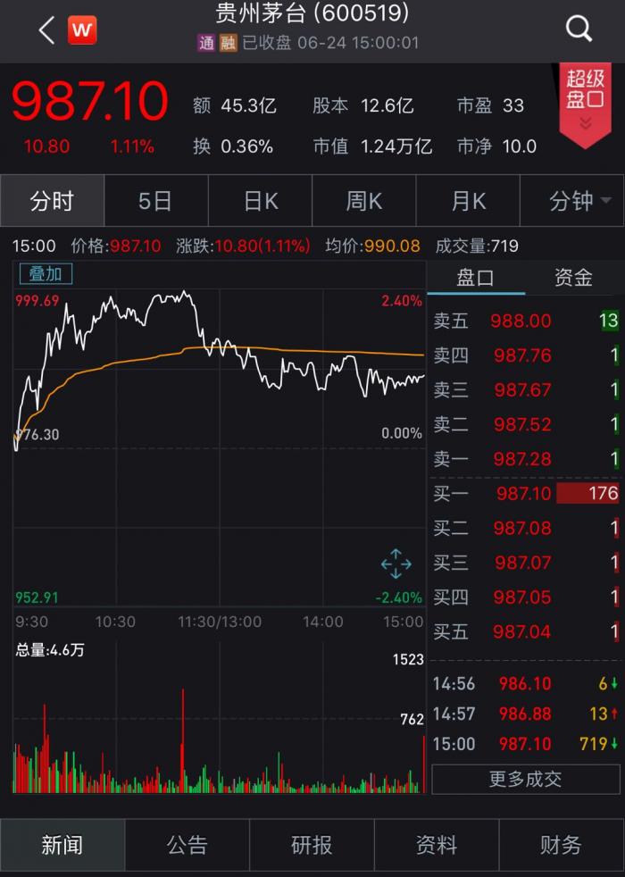 6月24日早盘,贵州茅台(600519.SH)股价又双叒再度逼近千元,盘中一度达到999.69元,但随后有所回落,截至收盘股价为987.10元,距离千元仅剩下1.31%的涨幅。