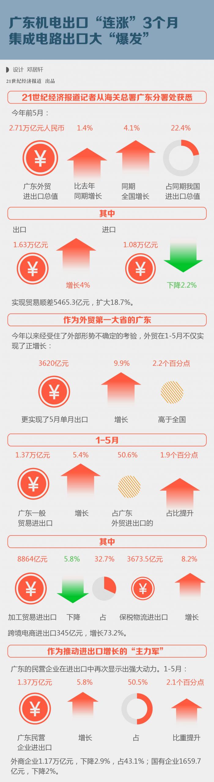 而出口机电产品中,集成电路产品又广受全球客户欢迎。例如,一季度,广东集成电路增长84.8%,1-5月,广东集成电路出口继续保持增长75.9%的趋势。