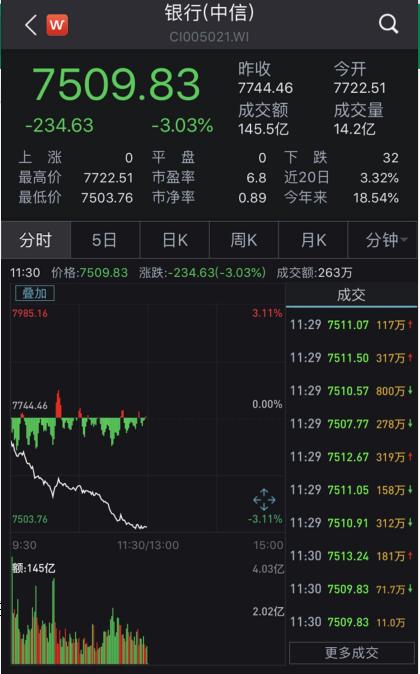 不仅招行,整个银行板块都“哀鸿遍野”。截至上午收盘,中信一级行业银行板块整体下跌3.03%,在所有行业板块中跌幅位居首位。