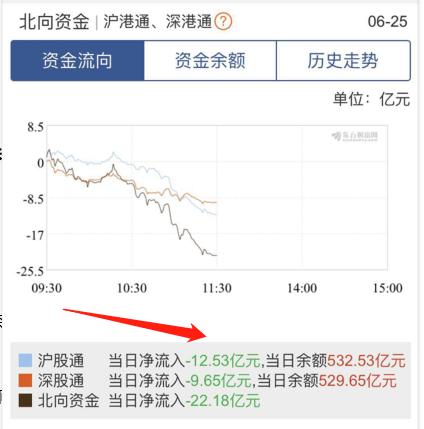 据东方财富数据显示,6月25日上午,北上资金合计净流出22.18亿元,其中沪股通净流出12.53亿元,深股通净流出9.65亿元。此前一个交易日,北上资金净流出16.48亿元。