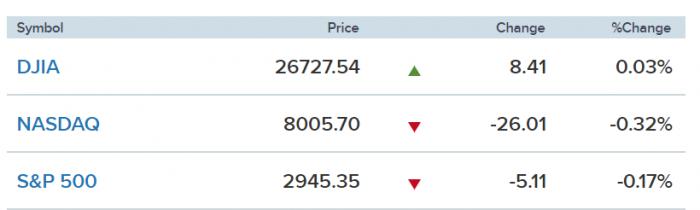 G20大阪峰会进入倒计时,投资者期待中美两国元首会晤,美股市场本周开局涨跌不一,标普500指数连续第二个交易日走低。截至收盘,道琼斯工业指数上涨8.41点至26727.54点,标准普尔500指数下跌0.2%至2945.35点,纳斯达克综合指数下跌0.3%至8005.70。