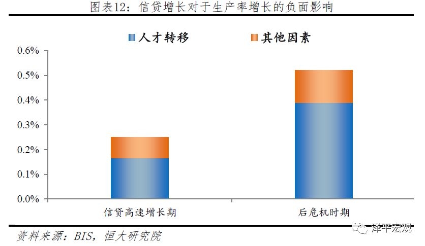 Borio和Kharroubi等(2015)通过研究21个发达经济体在1969-2009年的数据,进一步发现私人部门信贷相对于GDP每上升1个百分点,在信贷高速增长期,对于生产率增长的负面影响每年约0.25个百分点,在后危机时期,这一负面影响超过0.5个百分点,从10年期角度来看,对于生产率的负面影响接近4个百分点。长期、大量的金融资源流入低生产率领域,整体社会生产率降低,经济结构及韧性受到深远影响,显著增加了经济复苏的难度。
