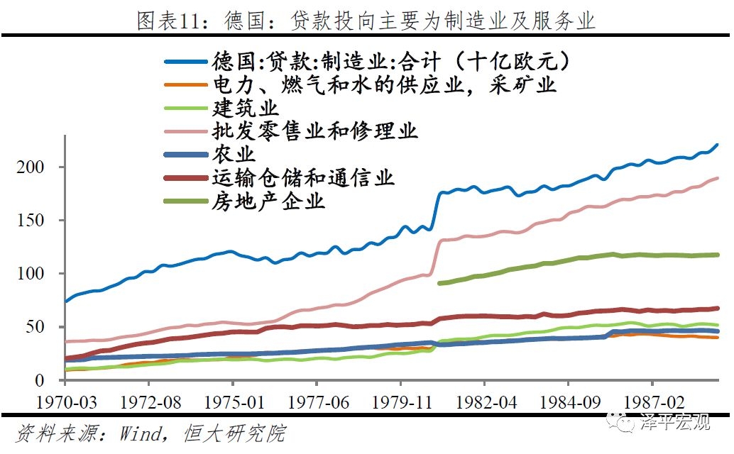 但信贷的结构性不必然带来经济结构的恶化。二战后到20世纪80年代,德国同样主要以信贷渠道作为主要传导渠道。但政府所重视的支柱产业是高附加值和技术密集型的汽车制造、航空航天、机械仪器和化工医药等产业,德国支柱性产业从90年代以前靠制造业,到90年代以后靠“现代服务业+制造业”。全能银行制度建立起银企之间更加全面的合作关系,减少信息不对称和道德风险,贷款对于相关产业的支持也成为成就“德国制造”的重要助推力。