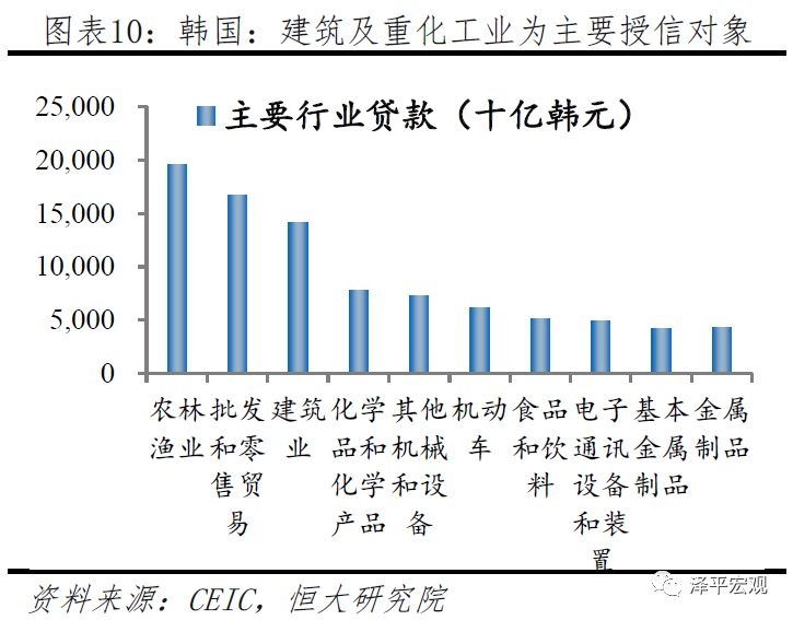 韩国在60-80年代的高速追赶期,同样存在着经济结构性问题,大量政府隐性担保的存在导致企业盲目扩张,存在投资饥渴症,缺乏自律性,过度的政策保护和扶持导致了低效率和高负债,1998年末建筑及其他重化工业产品成为韩国商业银行授信占比靠前的行业。此外,由于企业做的越大越能得到政府各种支持,导致大企业与中小企业差距越拉越大,财阀资产负债率高企,大量财阀资产负债率位于300-500%区间(任泽平,2010)。