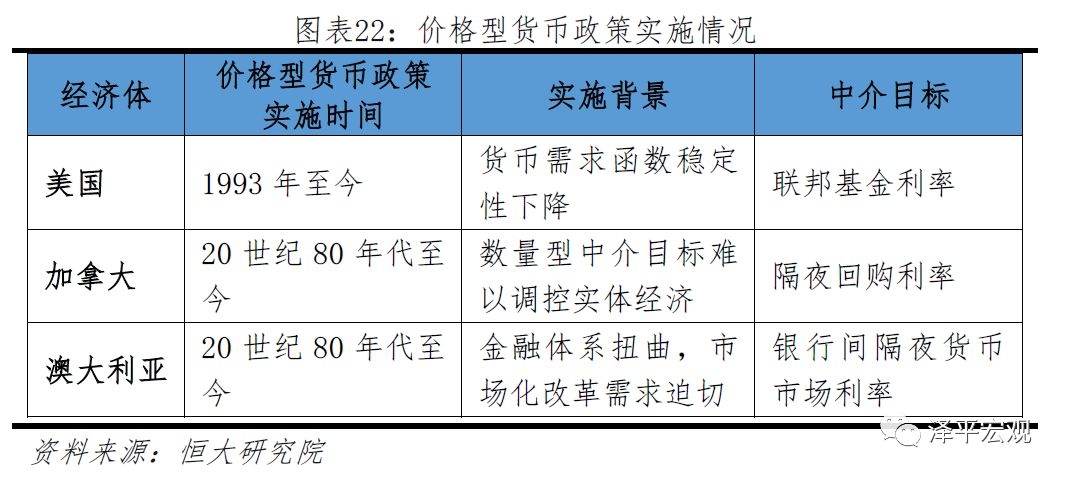 (3)20世纪80年代至金融危机前,由于金融市场的不断发展,金融创新及金融自由化影响,数量型中介目标无法有效掌控实体经济实际货币量水平,面临转型压力。同时新凯恩斯理论出现,吸收新古典主义思想,认为货币是内生的,短期非中性但长期是中性的,货币政策的主要功能应当是逆周期调节,通过控制短期利率,将总需求调整在潜在增长率附近,维持物价稳定。这一时期,主要国家货币政策中介目标再次转向价格型,并迎来了“大缓和”时期。