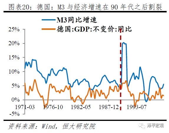 从我国情况来看,实施数量型货币政策以来,贷款增速与资本形成对GDP贡献率之间的相关性达到0.74,信贷有效支持内需,尤其对投资的融资支持有着显著贡献。韩国在数量型货币政策下,信贷增速同样与资本形成有着较高拟合度,1974年到1999年两者相关性达到0.57。德国的信贷增速与资本形成拟合度一般,但信贷增速与GDP增速相关性较高,在80年代货币政策操作框架转型之前相关性达0.72。