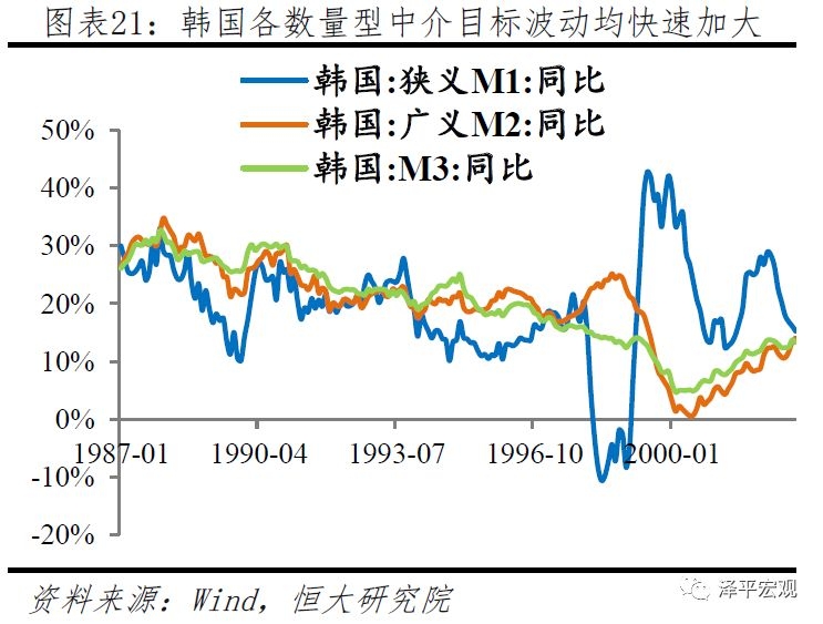 韩国在建国初期至20世纪90年代期间,由于数量型中介目标稳定性下降,不断扩大中介目标范围,从一开始的M1,逐步扩大至M2、MCT(包含M2、大额存单和货币市场基金)、以及M3。随着利率市场化不断推进,1997年韩国逐步取消所有存款利率管制,货币政策目标过渡至隔夜回购利率,1999年正式将货币政策调控框架由数量型转变为价格型。