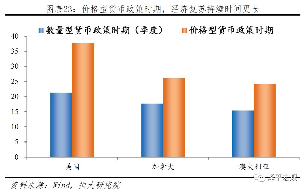 我们将美国、加拿大、澳大利亚三个国家的货币政策分为数量型时期及价格型时期,以GDP当季同比增速为主要指标,分别计算期间内每一次经济衰退后复苏持续的时间。在不考虑经济结构、基本面以及经济自身弹性的情况下,我们发现对单个国家而言,当货币政策框架从数量型转为价格型后,经济衰退后复苏的时间均显著长于数量型货币政策时期。
