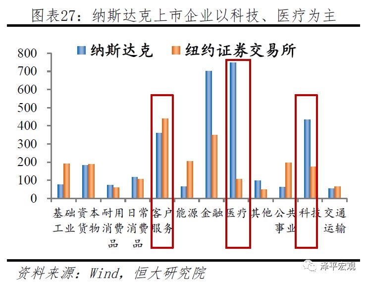 其次,资本市场的快速发展对于实体经济转型升级也能起到积极作用。纳斯达克上市企业中,除金融行业外,医疗、科技等领域上市企业显著高于其他行业,多伦多证券交易所上市企业中,除采矿业外,工业用品、科技、生命科学等领域上市公司也占据主导地位。股票市场较高的风险偏好为难以获得银行信贷、抵押品缺乏、甚至暂无盈利的新兴行业提供了有效的金融资源支持,有助于推动经济结构转型升级,形成新的增长引擎。