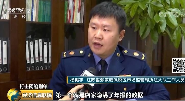 江苏省张家港保税区市场监管局执法大队工作人员 杨振宇:第一,店家隐瞒了年报的数据,涉嫌偷税漏税;第二,店家涉嫌在网上伪造了记录,涉嫌虚假宣传,也就是刷单。