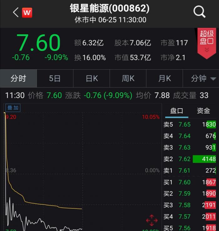 截至6月25日上午收盘,银星能源跌幅为9.09%,报收7.6元/股。