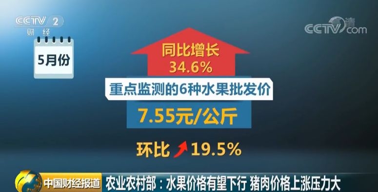 5月份重点监测的6种水果批发价每公斤7.55元,环比涨19.5%,同比涨34.6%。