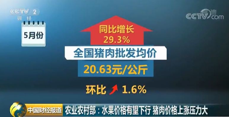 5月份全国猪肉批发均价每公斤20.63元,环比涨1.6%,同比涨29.3%,牛羊肉、鸡肉、鸡蛋价格总体走强,但同比涨幅都明显低于猪肉。