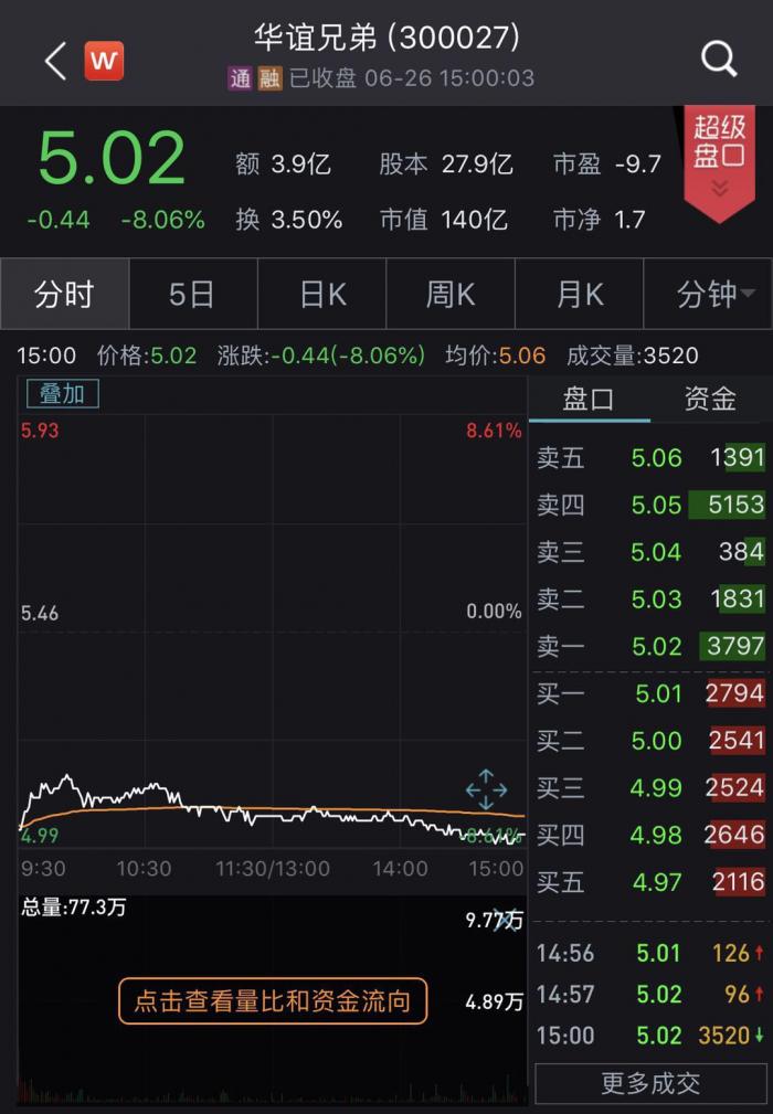 6月26日开盘,华谊兄弟股价即下跌超过7%,截至当日收盘,股价收跌8.06%。