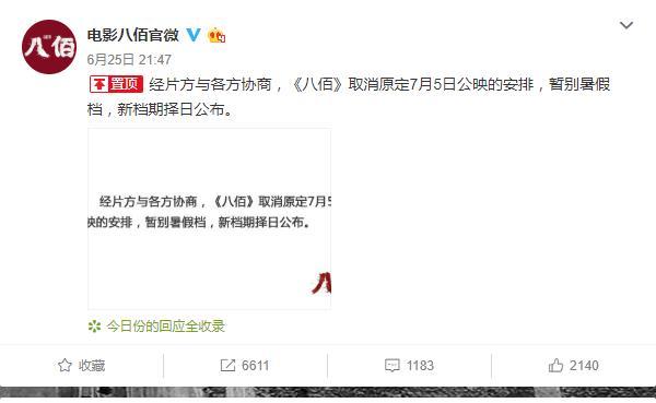 就在6月25日晚间,电影《八佰》宣布取消原定7月5日公映的安排,暂别暑假档,新档期择日公布。