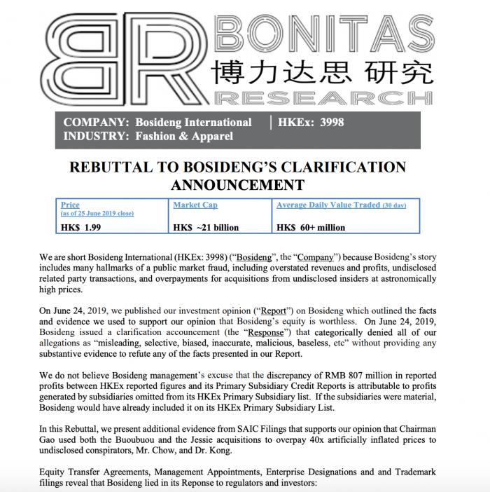 6月26日,双方进入第三天对峙,Bonitas再发第二份沽空报告,对于波司登的否认,Bonitas称“维持我们仍然做空波司登,并认为其股票最终没有价值的0.00港元。”