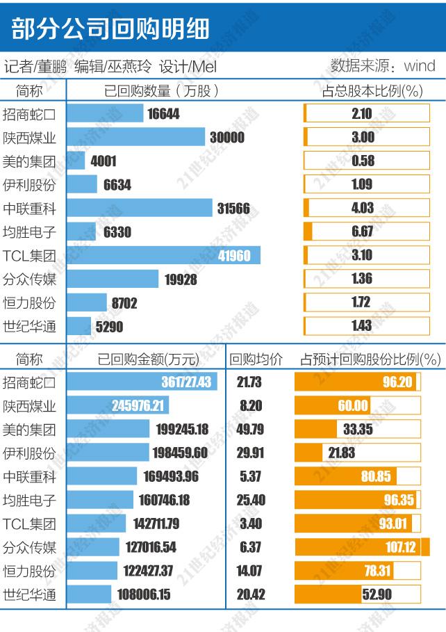 Wind数据显示,年内实施回购的A股上市公司中,招商蛇口已回购36.17亿元,陕西煤业(601225.SH)已回购24.6亿元,美的集团回购19.92亿元,伊利股份(600887.SH)已回购19.85亿元。