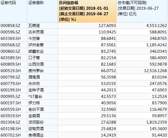 而从整个酒水行业年内涨幅来看,市值已过万亿的贵州茅台并非最大赢家,涨幅超过贵州茅台的比比皆是。