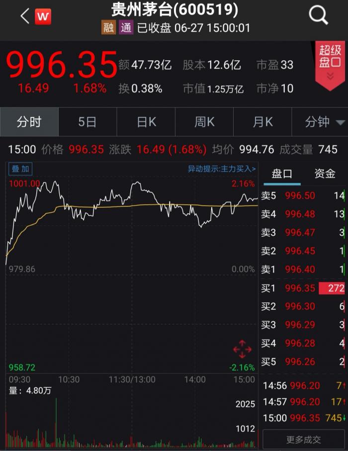 至当日收盘,贵州茅台报996.35元,当日涨幅1.68%。然而,茅台股价破千,无非是一个噱头。