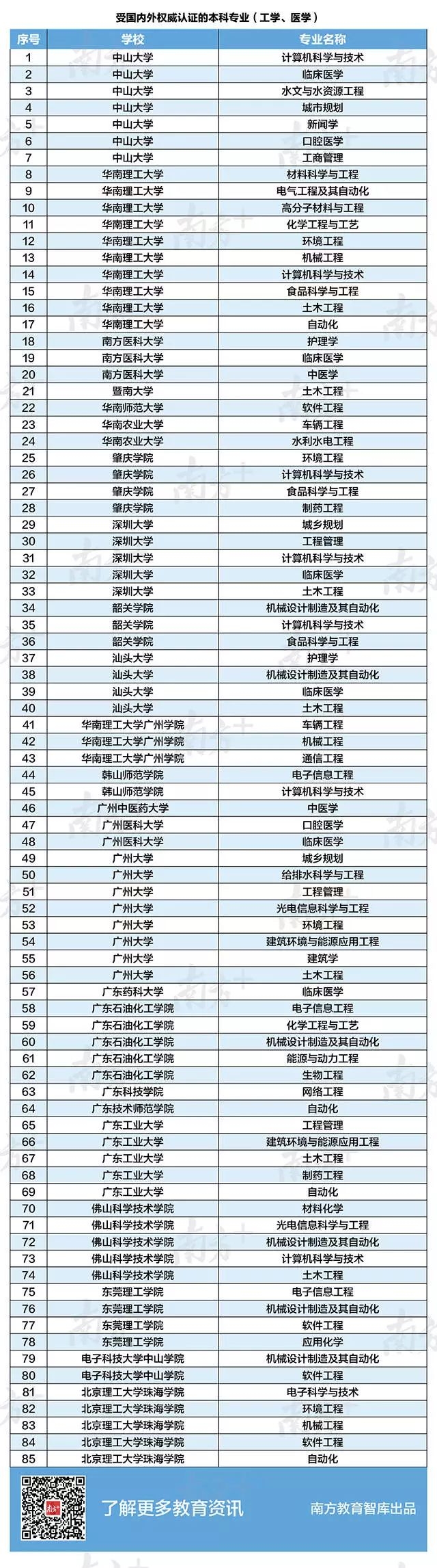 统计工学类和医学类专业发现,广东共有85个专业获得国内外认证,其中华南理工大学10个、广州大学8个、中山大学7个,位居全省前3位,理科考生可以作为参考。