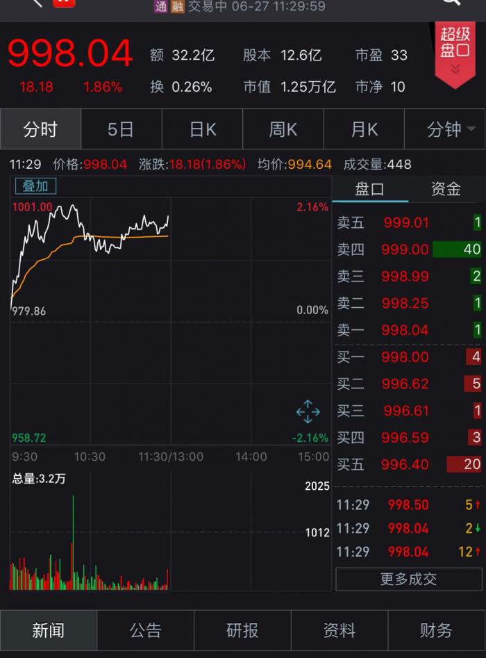 6月27日早盘,贵州茅台盘中不断放量,盘中最高价触及1001元,站在了历史关口,成为A股首只千元股。